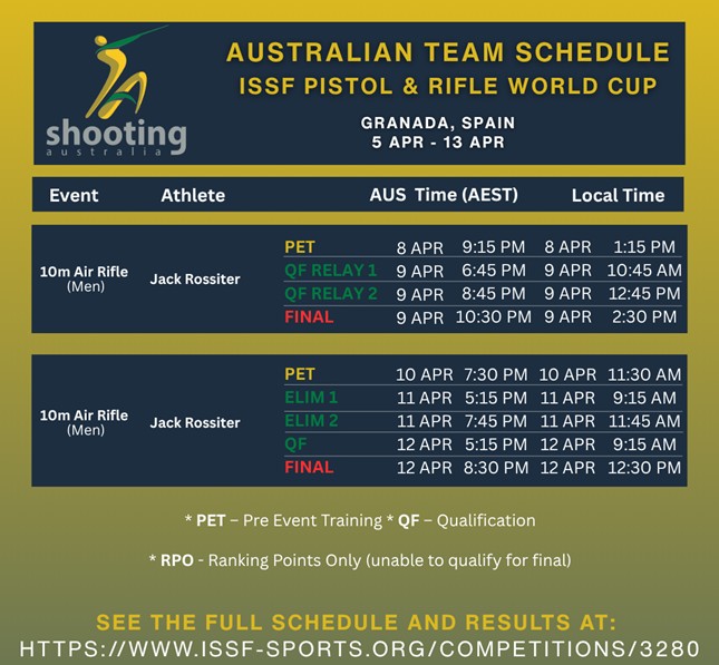 To keep up to date with all the action from the ISSF World Cup Spain, follow the Australian Team competition schedule below.
